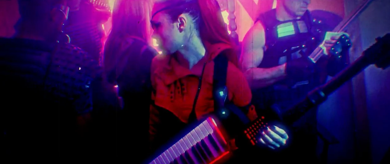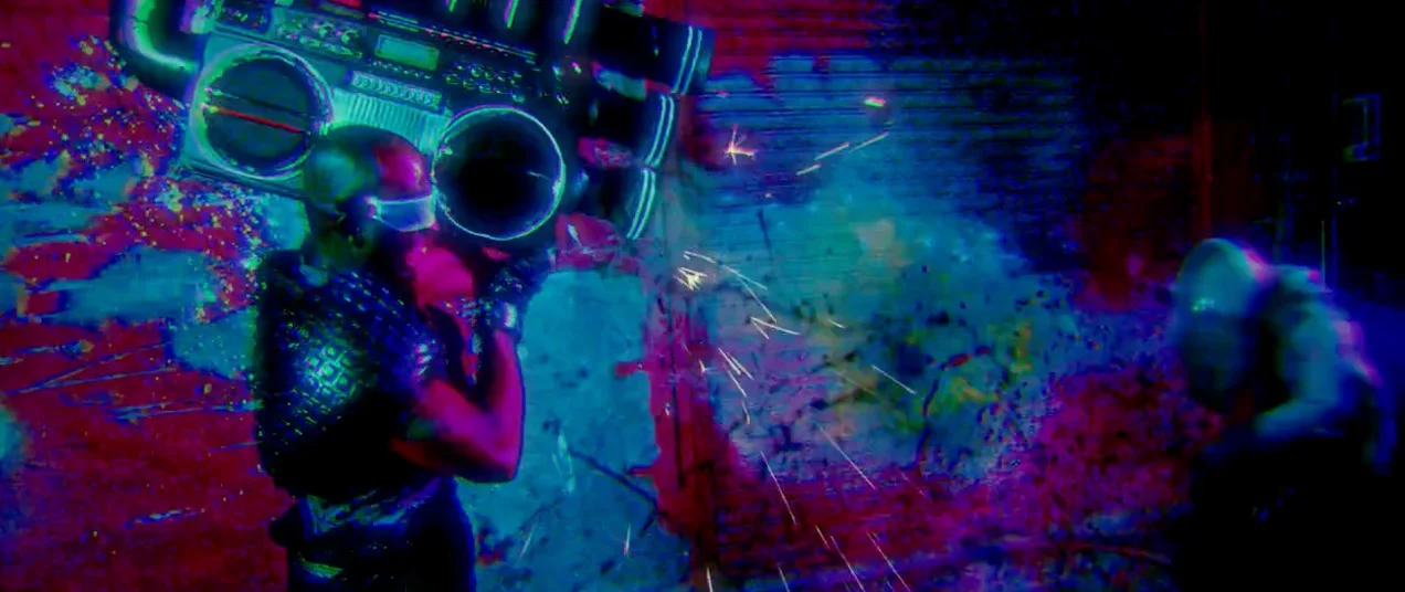 From the get-go, we are treated to everything awesome and everything ridiculous. Just look at that absurd weapon up there. It's a goddamn calculator taped to a Casio taped to a guitar. That's her weapon. And the other guy has a boombox with tubes on it. Because the music is what's lethal, here.